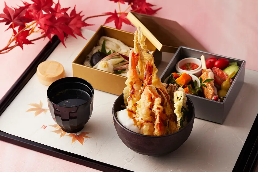 今年の秋御膳は、海老と穴子の天丼、焼き鳥、マスの刺身と卵の醤油漬け、稲庭うどんがセットになっており、折々の食材を彩りよく華やかに盛り付けました。デザートには秋の味覚、モンブラン最中が添えられています。