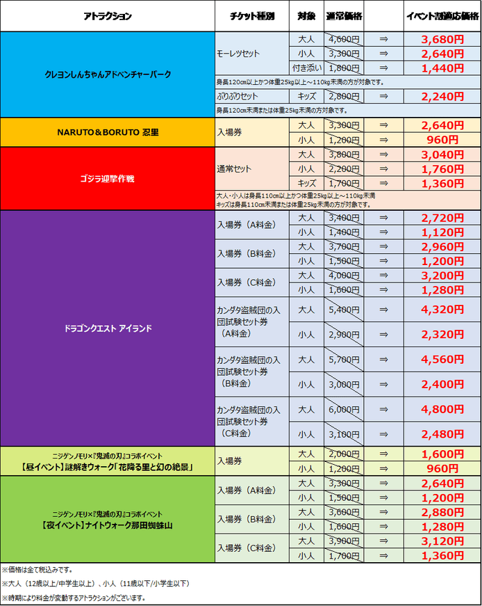 本チケットでは、「ドラゴンクエスト アイランド」入場券は、大人は通常3,400円~4,000円が2,720円~3,200円に、小人は通常1,400円~1,600円が1,120円~1,280円となります。「NARUTO&BORUTO 忍里」入場券は、大人は通常3,300円のところ2,640円に、小人は通常1,200円のところ960円でご購入いただけます。その他の各アトラクションも同様に20%OFFのお得な価格でチケットをご購入頂くことが可能です。