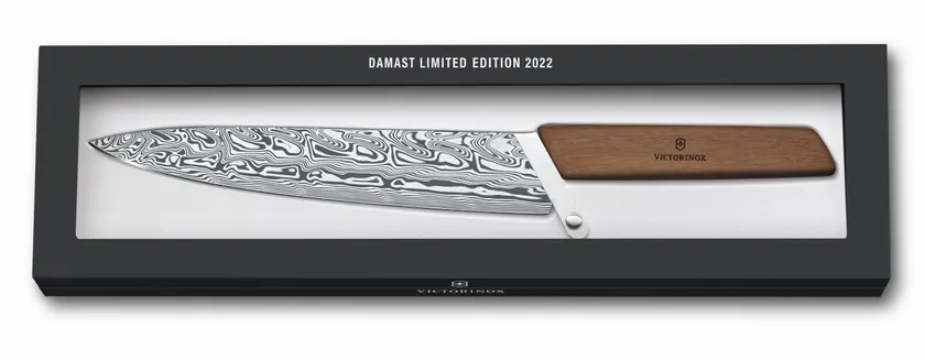 新作の「スイスモダン シェフナイフ22cm ダマスカス リミテッドエディション 2022」は、世界をリードするナイフメーカーとしてのビクトリノックスブランドの長年にわたる製造技術を体現しています。強靭さ、エレガンス、そして高い機能性を兼ね備えたナイフです。1,884本の限定生産で、裏面には製造年とシリアルナンバーが入り、証明書と共に美しいギフトボックスに梱包されています。
