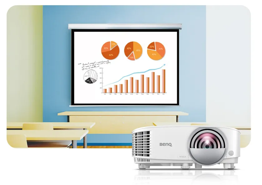 「MW826STH」は、1mの距離から約94インチの大画面を投写可能な教育機関・ビジネス向け、投写比 0.49の短焦点プロジェクターです。多様なニーズに応えるため、さまざまな解像度および投写画像サイズに対応しているほか、軽量かつコンパクトな設計を採用し、教室や会議室など設置場所を移動することも容易です。