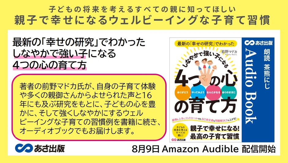 株式会社あさ出版(代表取締役:田賀井弘毅、所在地:東京都豊島区)は、世界最大級のオーディオブック及び音声コンテンツ制作・配信サービスであるAmazon Audibleにて、前野 マドカ著『最新の「幸せの研究」でわかった しなやかで強い子になる4つの心の育て方』( https://amzn.to/3vE7Q8k )の配信を2022年8月9日に開始いたします。
