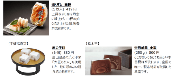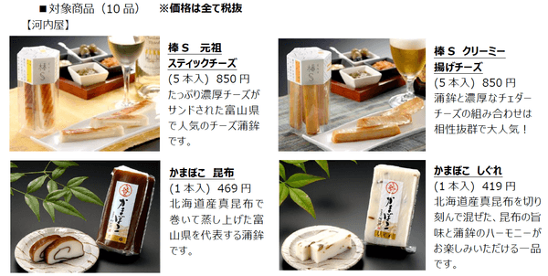 コロナ禍により影響を受けた生産者の支援を目的に、5月・8月に老舗蒲鉾メーカー「河内屋」を始めとする富山県の銘産品を特別販売いたしました。富山県フェア第3弾の今回は、お土産として人気のお菓子や練り物計10品を特別販売いたします。