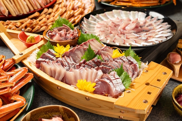 『美人の湯』で名高い夕日ヶ浦の高台から絶景を望むホテル。新春は贅沢に伊根ぶりの食べ放題が登場!勿論豊富なカニメニュー、ステーキやお寿司などの定番メニューも多数取り揃えております。温泉と豪快ビュッフェで、心もお腹も大満足。