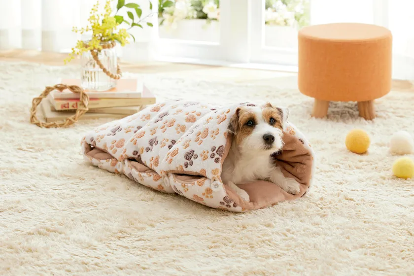 かわいい肉球柄のふわふわベッド。