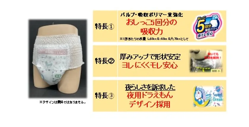 そこでこのたび、『マミーポコ』ブランドから、吸収力を強化し、5回分のおしっこを吸収する夜専用の紙おむつ『マミーポコパンツ 夜用』を発売します。