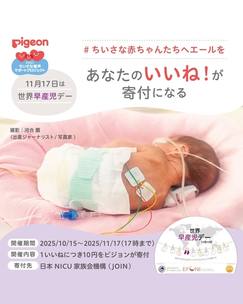 ピジョンInstagram「子育てのヒント」(@pigeon_celebrate.babies)の対象投稿にいいねをしよう! 1いいねにつき10円を、ちいさく早く生まれた赤ちゃんの支援を行っている日本NICU家族会機構(JOIN)に寄付いたします。