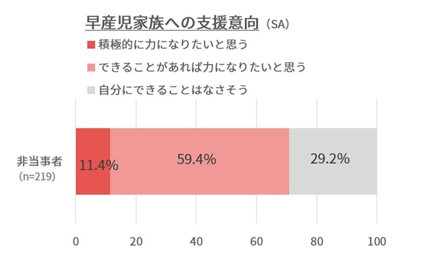 一方で、早産児ご家族への支援に関して「積極的に力になりたいと思う」(11.4%)、「できることがあれば力になりたいと思う」(59.4%)と回答した非当事者は約7割であり、支援意欲の高さが明らかとなりました。