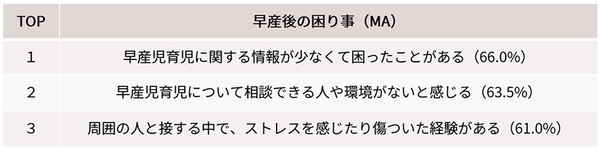 当事者に対して「早産を経験した後の困り事」について聞くと、回答の上位には「情報不足」(66.0%)や、「相談できる人や環境がないと感じる」(63.5%)、「周囲の人との関わり」(61.0%)が挙げられました。