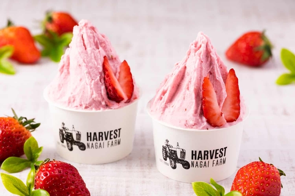旬の果物のジェラートが楽しめる「HAERVEST NAGAI FARM」では、いちごを使ったまるごといちごジェラートを味わうことができます。素材本来の甘さを活かし、いちご果肉のつぶつぶ感を感じられる他、優しい甘みが特徴です。