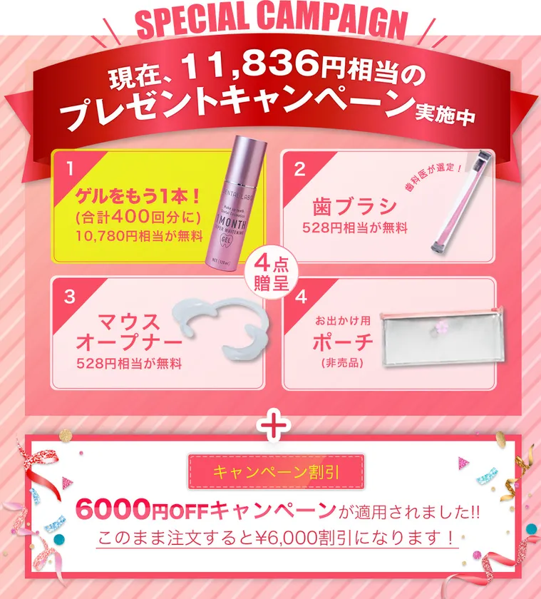 現金6,000円OFFで定価 税込75,900円→税込 69,900円(※24分割時2,913円/月)で、さらに薬用ホワイトニングゲル400回分付き(内80回分相当のゲル1本とその他3品)を無料プレゼント!