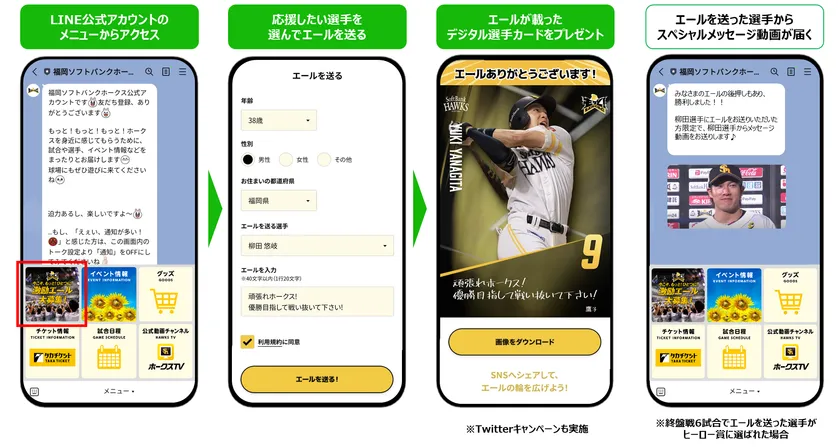 また、エールを送った選手が対象の6試合でヒーロー賞を獲得した場合、その選手を選んだ方にはLINE公式アカウントにスペシャルメッセージ動画が届きます。