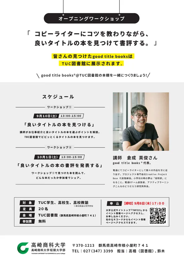9月10日(土)同日、「good title books@TUC図書館」のオープンを記念したワークショップを開催します。本ワークショップは、参加者が倉成 英俊氏のレクチャーを受けながらTUC図書館に所蔵されている良いタイトルの本を見つけて書評するというもの。参加者が選んだ書籍は、倉成氏が選定した書籍とともに「good title books@TUC図書館」の本棚に並べられます。参加者それぞれが自分の心に響く1冊を見付けながら本棚を完成させる参加型ワークショップとなっています。TUC学生のほか、高校生や高校教諭の参加が可能です。
