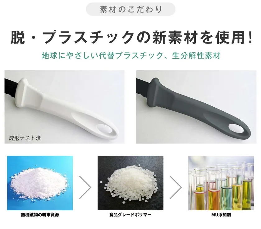 無機鉱物粉末資源に生分解性樹脂を添加し、特殊なプロセスで処理することでプラスチックに代わる新しい無機分解性素材です。