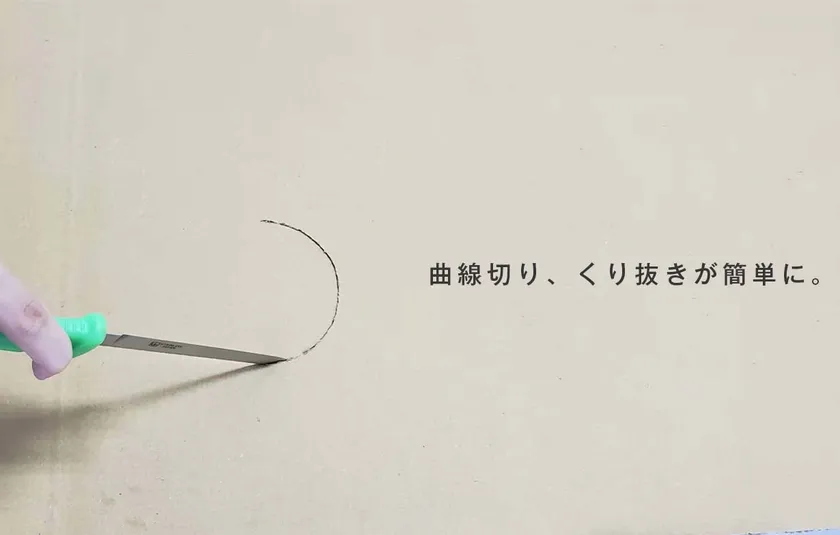 カットするときの抵抗が少ない特殊加工で、ダンボールも発泡スチロールもPPバンドもしっかりカットでき、切り屑も出にくく、カッターナイフではやりにくかった丸く穴をあける作業も貫通力とダブル刃加工によるカット能力で楽々。