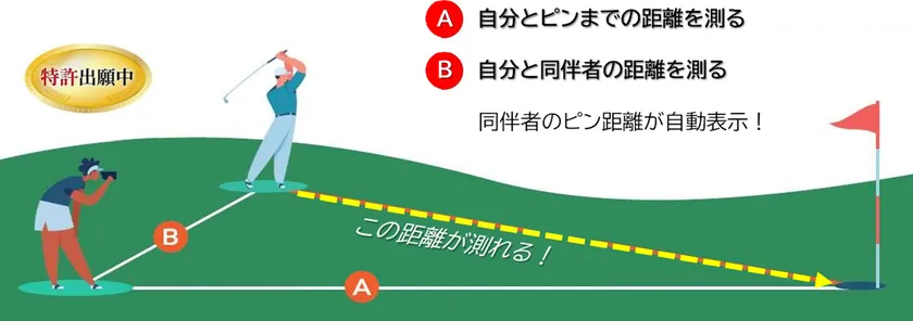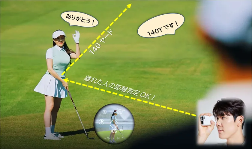 従来は距離計を持っている人が持っていない同伴者の場所まで行かないとピン距離が測れませんでした。近い場所であればいいですが、遠く離れていると自分の場所から往復する必要があり時間がかかり大変です。