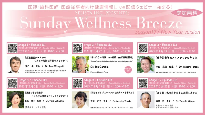 セリスタ株式会社(東京都千代田区、代表取締役:伊藤 承正)は、医師・歯科医師・薬剤師・医療従事者向け無料オンラインセミナー「Sunday Wellness Breeze」のSeason 17 Special Editionとして、2023年1月15日(日)から6回にわたり、日曜日の10:00~12:00に、『10回ミネラル・有害金属セミナー』を開催します。