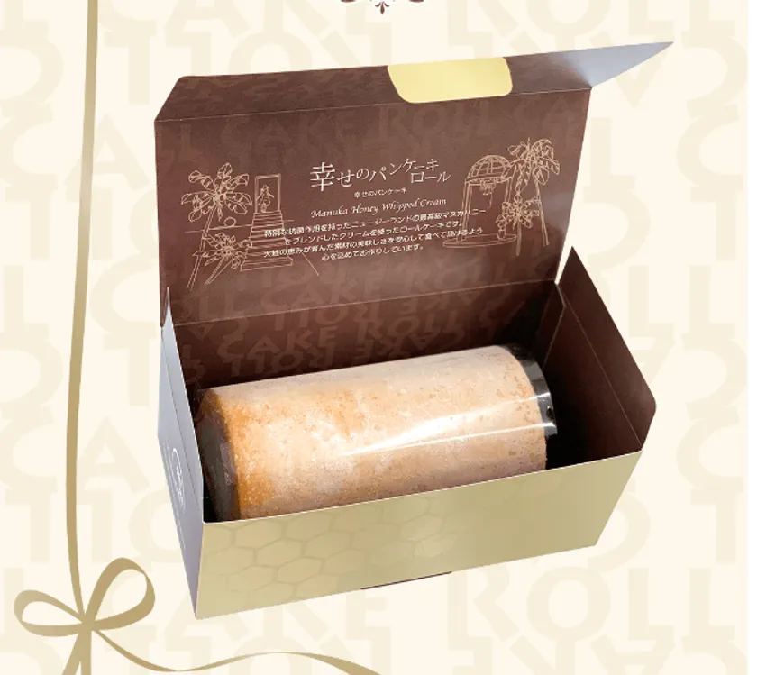 新商品は「幸せのパンケーキロール」、「幸せのパンケーキ」の代名詞とも言える特別な抗菌作用を持ったニュージーランド産はちみつ「マヌカハニー」をたっぷり使った甘さ控えめのホイップクリームは食べた瞬間に芳醇な香りを感じていただけます。