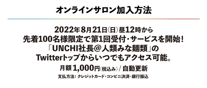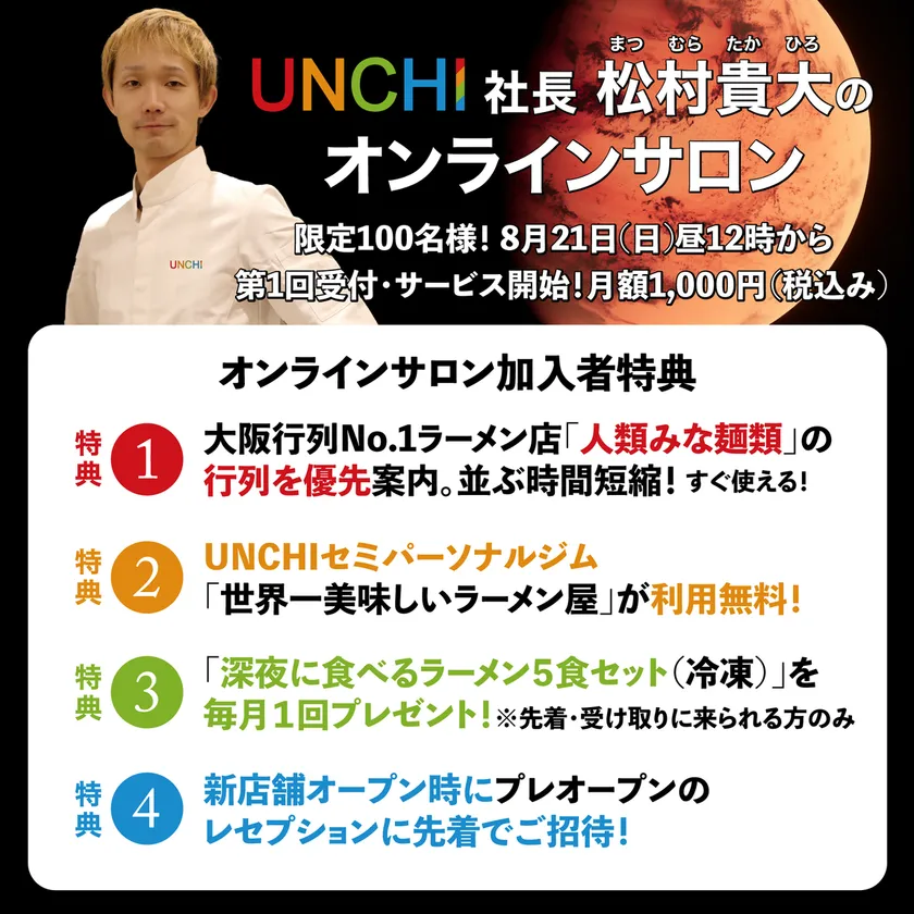 大阪行列No.1ラーメン店「人類みな麺類」をはじめとした、話題の行列ラーメン店を複数運営するUNCHI株式会社(本社所在地:大阪市淀川区、代表取締役:松村 貴大)は、2022年8月21日(日)午後12時から「#UNCHI社長のオンラインサロン」の第1回メンバー募集受付とサービスを開始いたします。