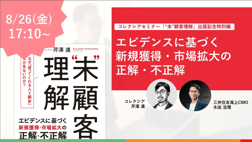 本セミナーでは最新のマーケティング研究のエビデンスに基づき、「未顧客」へのマーケティングで行うべきことは何かを、「未顧客理解」著者の芹澤連が、三井住友海上CMOの木田様をお招きしご紹介いたします。