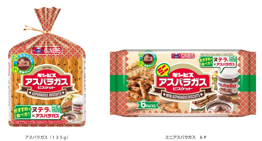 世界的に愛されているチョコスプレッド「ヌテラ」とのコラボレーションパッケージを展開。朝食やおやつに、様々なシーンで「アスパラガスビスケット」に「ヌテラ」をつけてお召し上がりください。ヘーゼルナッツとココアの濃厚でまったりとした味わいが特長の「ヌテラ」は、「アスパラガスビスケット」の甘味・塩味と相性抜群です。