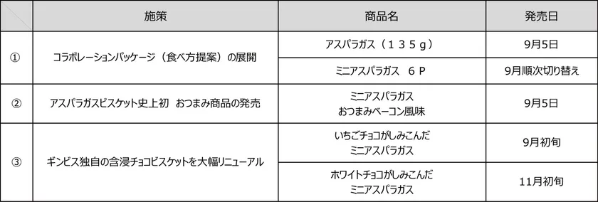 株式会社ギンビス(本社:東京都中央区、代表取締役社長:宮本 周治)は、55年目を迎えるロングセラー商品「アスパラガスビスケット」の挑戦として3つの施策で「話題喚起」と「ブランド強化」を行います。