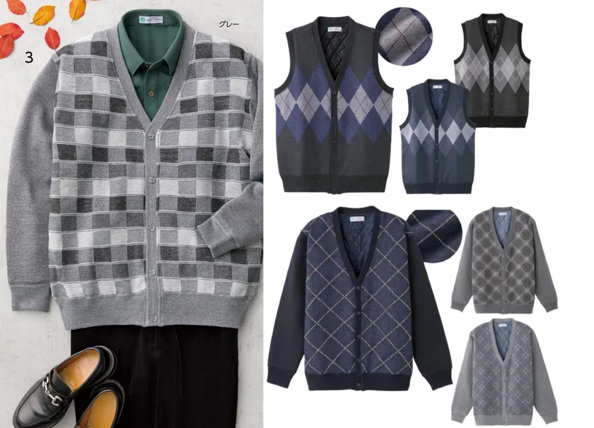 ■紳士ベスト&カーディガン3点を商品化。秋冬使用の裏中綿キルトで保温性も抜群
