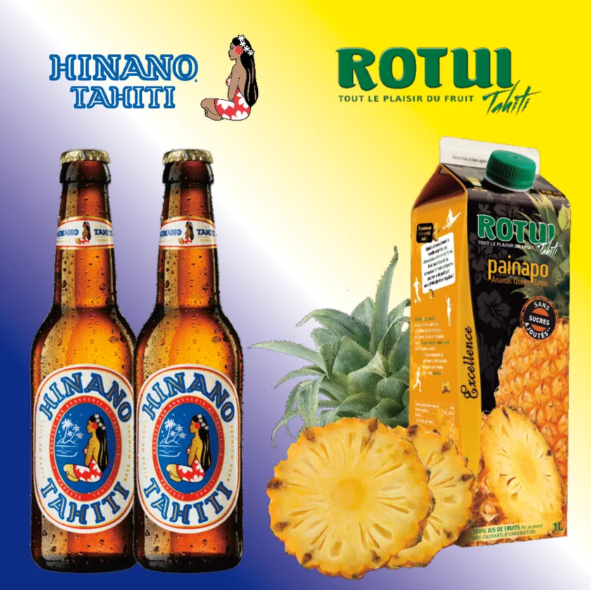 タヒチNo1ビール「ヒナノタヒチ」は可愛いラベルで大人気です。またタヒチモーレア島の高級パイナップル、タヒチモーレア島産クイーンタヒチ100% [ROTUIパイナップルジュース]もお楽しみいただくことができます。
