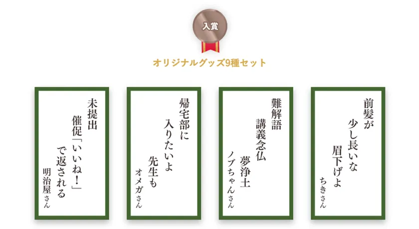 「教育に関するすべてのあるある」をテーマに、教員や教育従事者、親世代や学生の皆様から幅広い観点からの作品が寄せられ、中には全国の学校からの団体応募もいただくなど、前年を大きく上回る多くの方にご参加いただきました。力作の数々をご覧いただくとともに、ぜひ、来年の「教育あるある川柳キャンペーン」もよろしくお願いいたします。