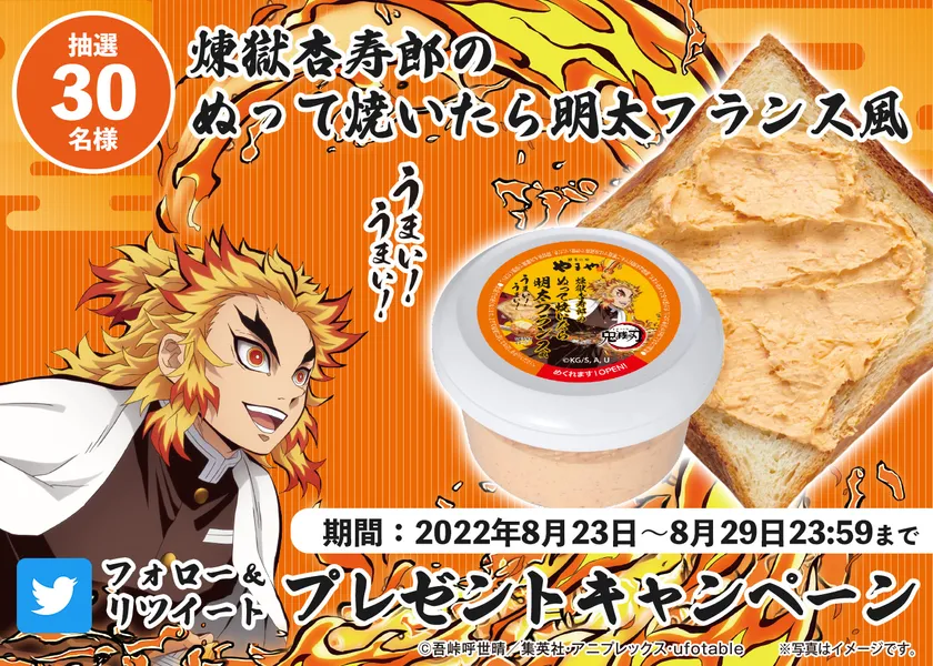 「煉獄杏寿郎のぬって焼いたら明太フランス風」が 抽選で30名さまに当たるTwitterキャンペーンを8/23より実施
