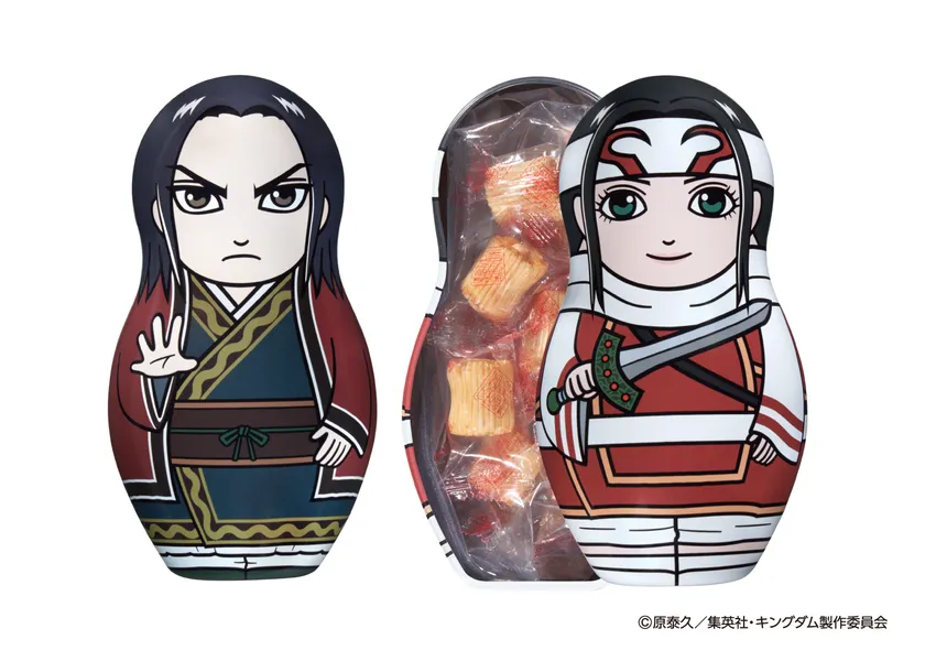 ビジネスマンを中心に幅広い世代から人気のTVアニメ「キングダム」が、やまや「めんたいチーズおかき」とコラボレーション!第2弾として、「エイ政」、「羌カイ」がデフォルメスタイルの缶で登場。