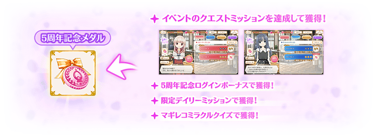 本イベントのクエストミッションを全て達成することで「5周年記念メダル」40枚が獲得できます。また、マギアストーン合計240個をはじめ、限定ホーム背景「星屑のミラージュ」や限定メモリア「求める光、救われる未来」が獲得できます。