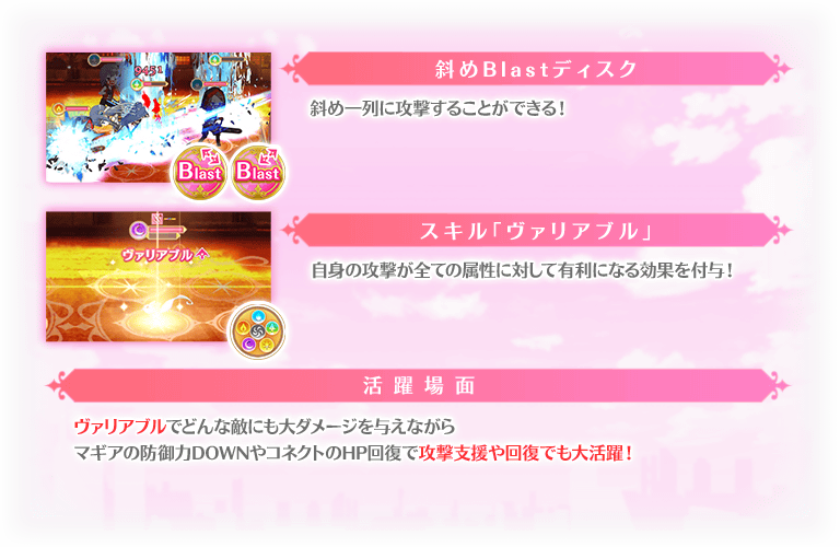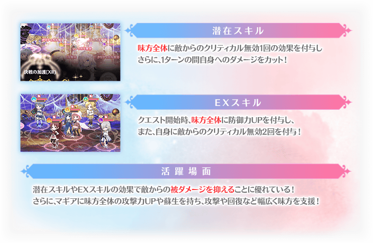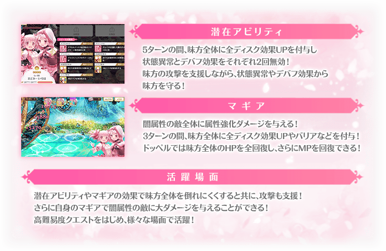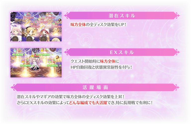 対象の魔法少女を編成して本イベントクエストをプレイする際にステータスを特殊な状態に強化することができます。