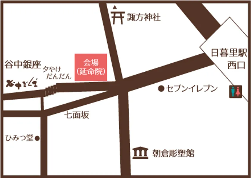 会場となる延命院は、江戸時代に開創された歴史あるお寺です。日暮里駅から徒歩3分、谷中銀座まで徒歩1分という、谷中散策の最適な場所に位置しています。