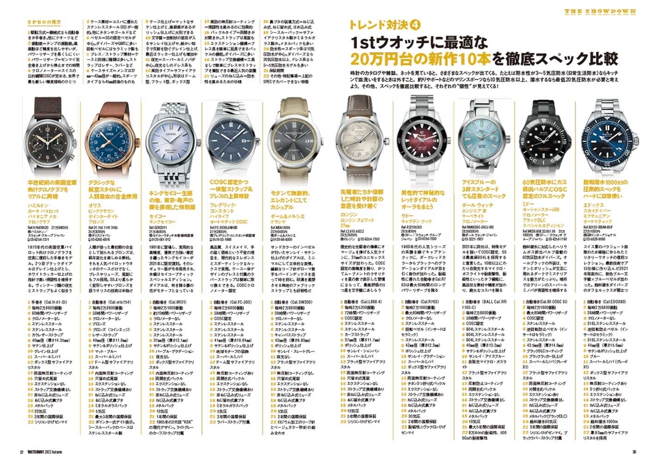 ブライトリング、タグ・ホイヤー、IWCシャフハウゼン、オメガ、ゼニスの2大定番を、歴史、スペック、使い勝手などを比べてWN流の勝敗を決める「同門対決」に加え、ステンレススチールとチタンのグレード比較、次世代の定番素材として採用相次ぐカーボンとセラミックの可能性など、素材別の検証を実施。また、20万円台で購入可能な最新10モデルの詳細スペックからハイコストパフォーマンスウオッチを導き出す検証企画に、定番ダイアルカラーの最新事情、仕上げやメカニズムの優劣に迫る二者択一への解答まで、あらゆる選択肢の難問からWN流の最適解を提示しました。