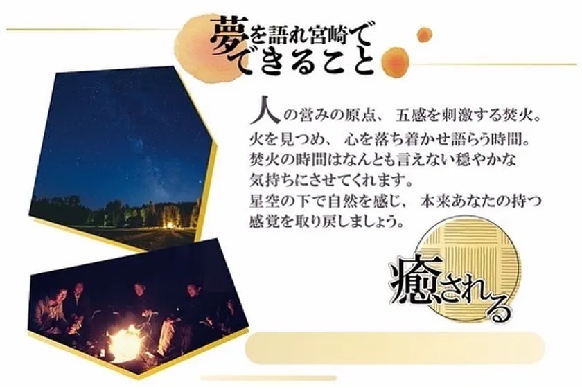 『星空の下で夢を語れ』というキャンプ事業を行う、夢を語れ宮崎(所在地:宮崎市中村、代表:松下裕紀)は、宮崎の自然の中でキャンプができる「星空の下で夢を語れ」の先行予約販売をクラウドファンディングサイト「CAMPFIRE」にて2022年8月16日(火)に開始しました。