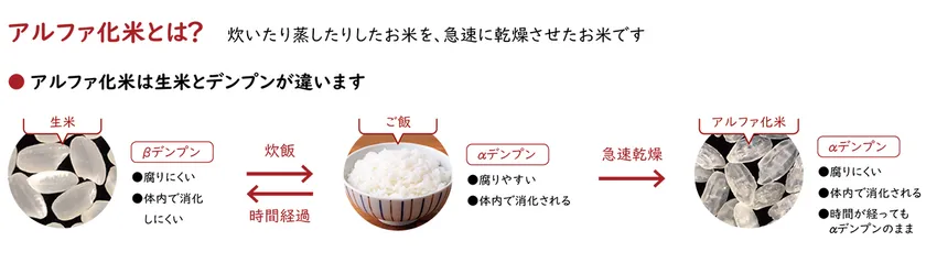 アルファ化米とは、生米を炊いたり蒸した後、熱風で急速に乾燥させた米。通常に炊飯したご飯と同じデンプン構造を維持しているためおいしさはそのままで、生米と比較すると洗米・つけ置きが不要で短時間で簡単に炊くことが可能。