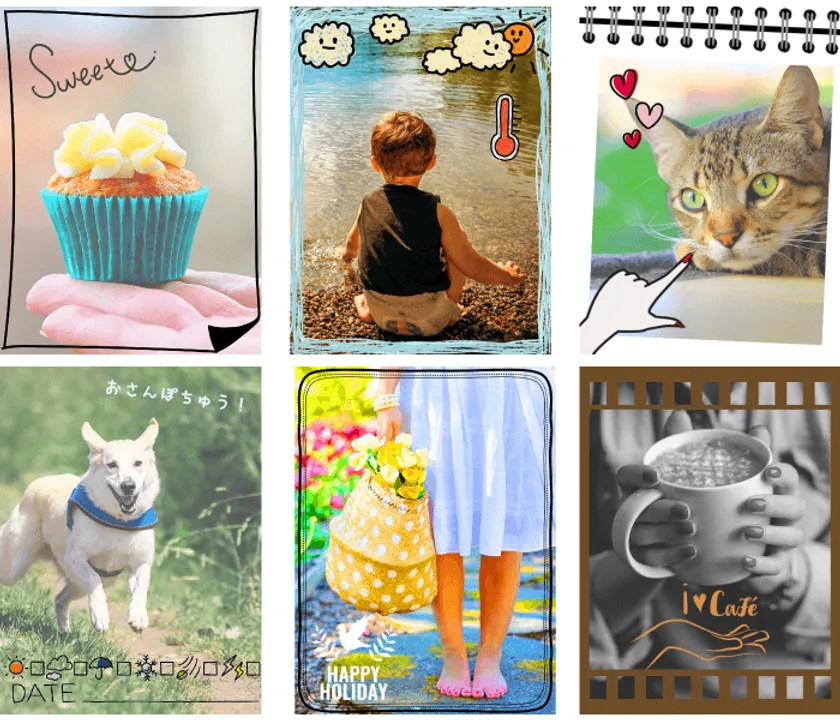 『ハクション大魔王』『アクビガール』『めんトリ』『ぶにゃん』等、人気キャラクターの素材も豊富に取り揃え、簡単操作でおしゃれな写真が仕上がります。