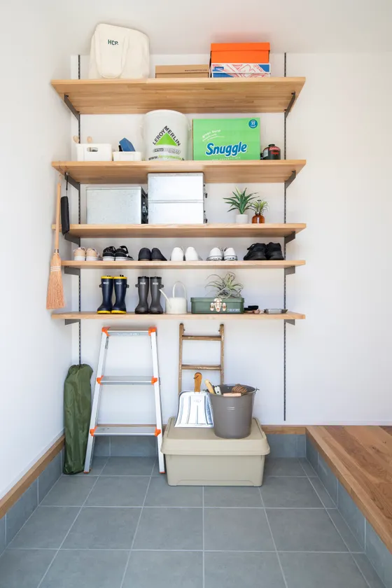 家族の趣味道具が一緒に並ぶ様子が楽しい、オープンなシューズラック
