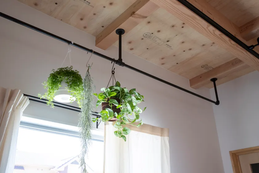 ハンガーパイプにグリーンや小物を吊るして飾れる、遊べる天井