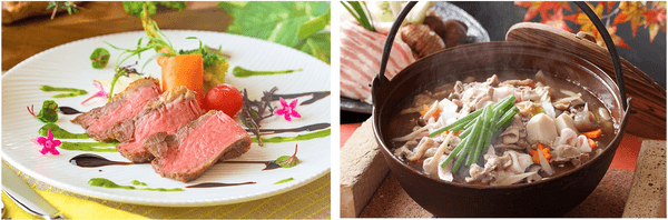 左:宮城県産豚肩ロースを塊のまま焼き上げて旨味を閉じ込めたロースト料理。仙台味噌をベースとしたソースとご一緒に。