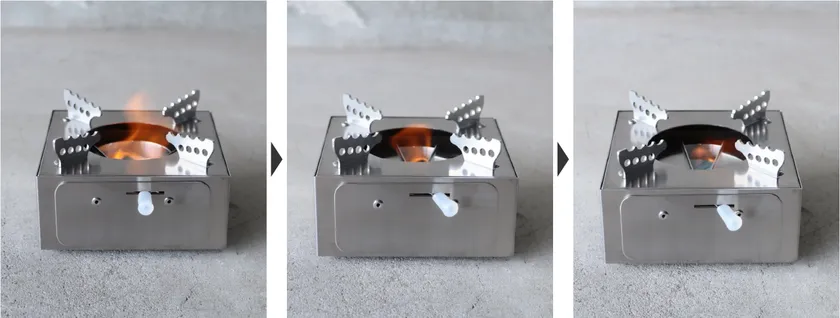 使用する燃料は固形燃料または燃料用アルコールのため、炭のように火起こしする必要がなく、大幅な時間短縮が可能。ありそうでなかったアウトドアコンロです。