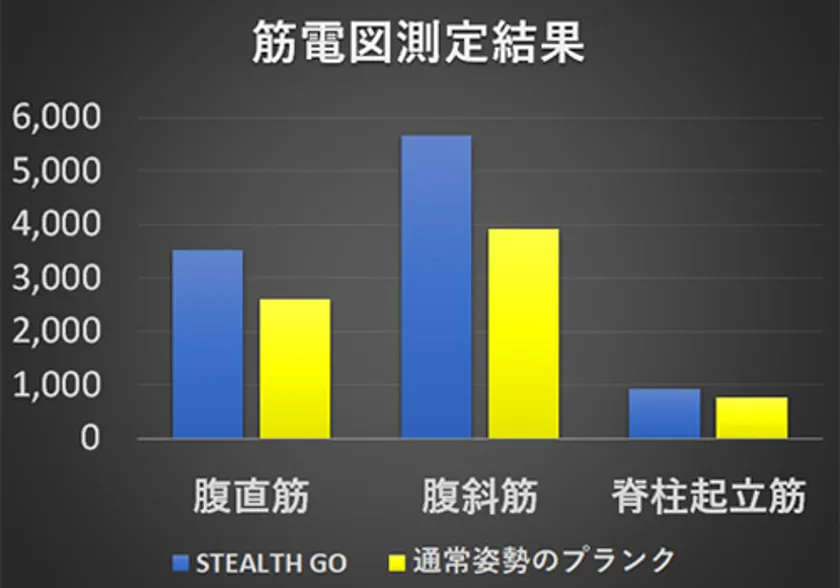 何と『STEALTH GO』(ステルスゴー)を使用したプランク運動と通常のプランク運動の筋活動量を第三者機関にて比べた結果、腹直筋の活動量が最大140%増加しました。
