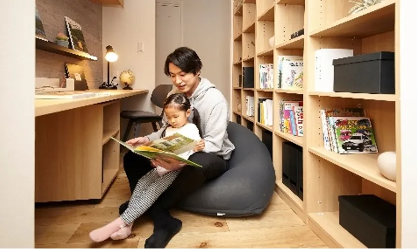 2Fホールに家族で本を共有できる本棚を。本を手に取りやすくなることで子どもの読書習慣が生まれ、本を通じた親子のコミュニケーションも育みます。