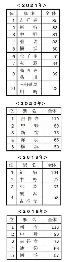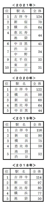 毎年2番手を競う2位「横浜」、3位「新宿」は、今回「吉祥寺」との差を若干縮めています。