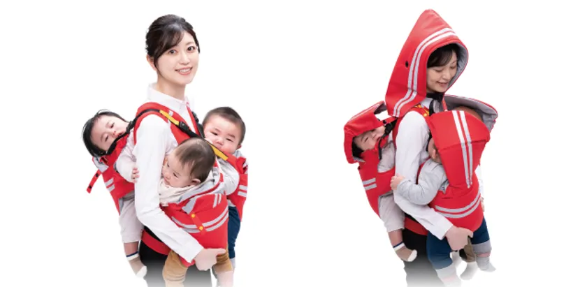 3人抱っこできる避難用抱っこひもがキッズデザイン賞を 受賞 抱っこひもに慣れていなくても素早く・安全に避難