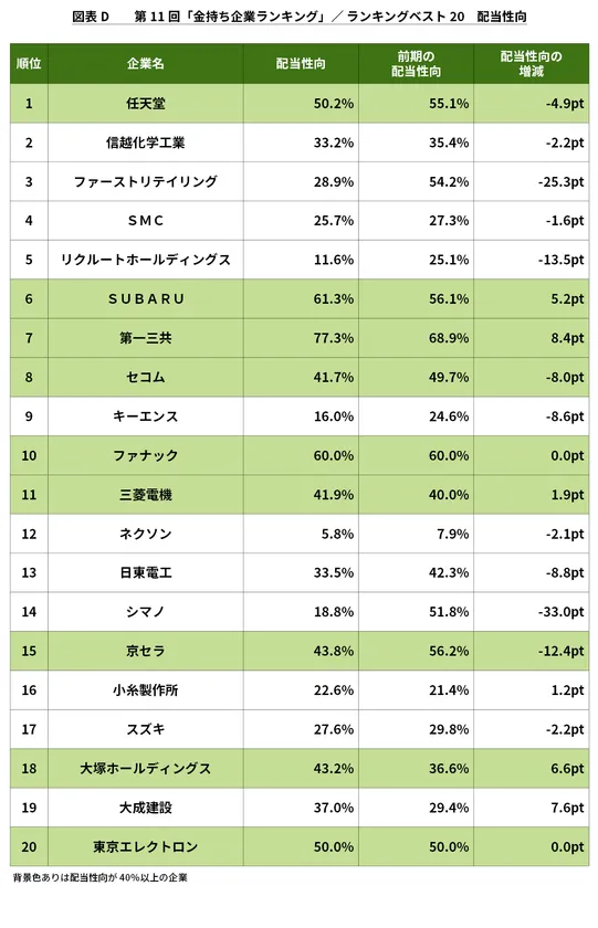 前年度との比較では、20社中12社の配当性向が低下しており、前年度に100周年記念配当を実施したシマノ(前年度51.8%→今年度18.8%)、前年度から純利益が2倍となったファーストリテイリング(同54.2%→同28.9%)は、前年度から配当性向が20ポイント以上低下する結果となっています。(図表D)
