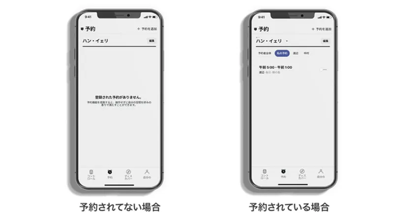 アプリには香りの管理ができる「コントロール」、動作時間の設定が可能な「予約」、香りとブレンド情報などインサイトがある「ディスカバー※」、各種の設定が可能な「マイページ」があります。