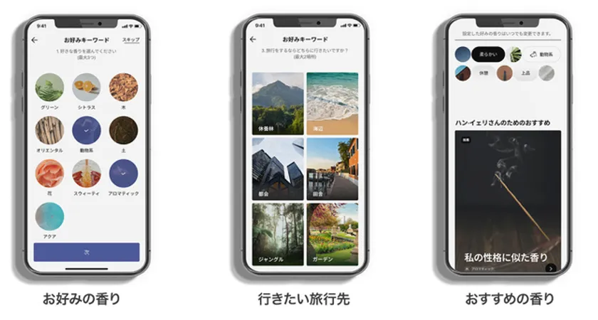 5つの質問((1)お好みの香り、(2)好みでない香り、(3)行きたい旅行先(場所)、(4)キーワード、(5)ご利用シーン)に答えると「おすすめの香り」が表示されます。