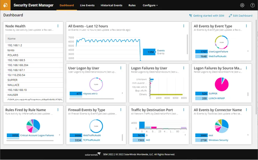 SolarWinds SEMは、サイバー攻撃の脅威を検出し、ITインフラストラクチャのコンプライアンスを維持するために設計された、ログ収集、保存、分析、レポートのためのオールインワンかつシンプルなSIEM (Security Information and Event Management) ソリューションです。製品組み込みの多数のコネクタやレポートテンプレートが利用できるため、最小限の専門知識とコストですぐに利用できるSIEMとして、世界中の多くのお客様に利用されています。