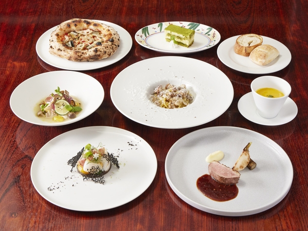 軽く炙ったアオリイカと柿のピクルス、紅葉鯛のヴァポーレ秋茸ブイヨン仕立て、マグレ鴨胸肉のロースト丹波黒味噌ソース、姫路レンコンと秋刀魚のピッツァなど、秋を彩る全7品。ポルチーニ茸や地元カボチャを取り入れ、目にも鮮やかで“実り”を感じるイタリアンコースです。